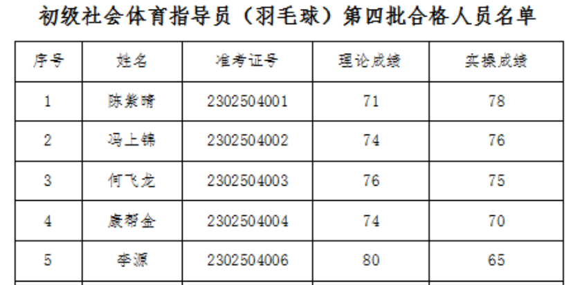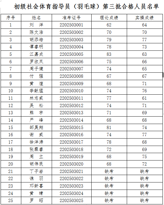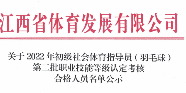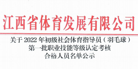 關(guān)于2022年初級社會體育指導(dǎo)員(羽毛球)第三批職業(yè)技能等級認(rèn)定考核合格人員名單公示 根據(jù)《江西省人力資源和社會保障廳關(guān)于公布江西省第...